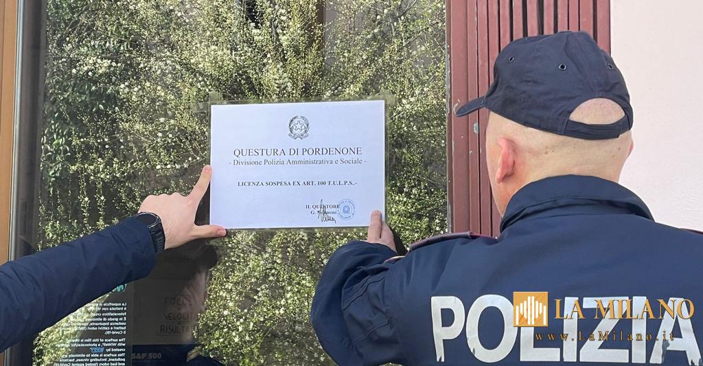 Nella mattinata di lunedì 04 marzo 2024, personale della Divisione della Polizia Amministrativa e Sociale e dell’Ufficio Prevenzione Generale e Soccorso Pubblico della Questura di Pordenone hanno eseguito il provvedimento di sospensione della licenza ex art. 100 del T.U.L.P.S. (Testo Unico delle Leggi di Pubblica Sicurezza), disposto dal Questore della Provincia di Pordenone, per 75 giorni nei confronti di un pubblico esercizio sito a Vigonovo di Fontanafredda.